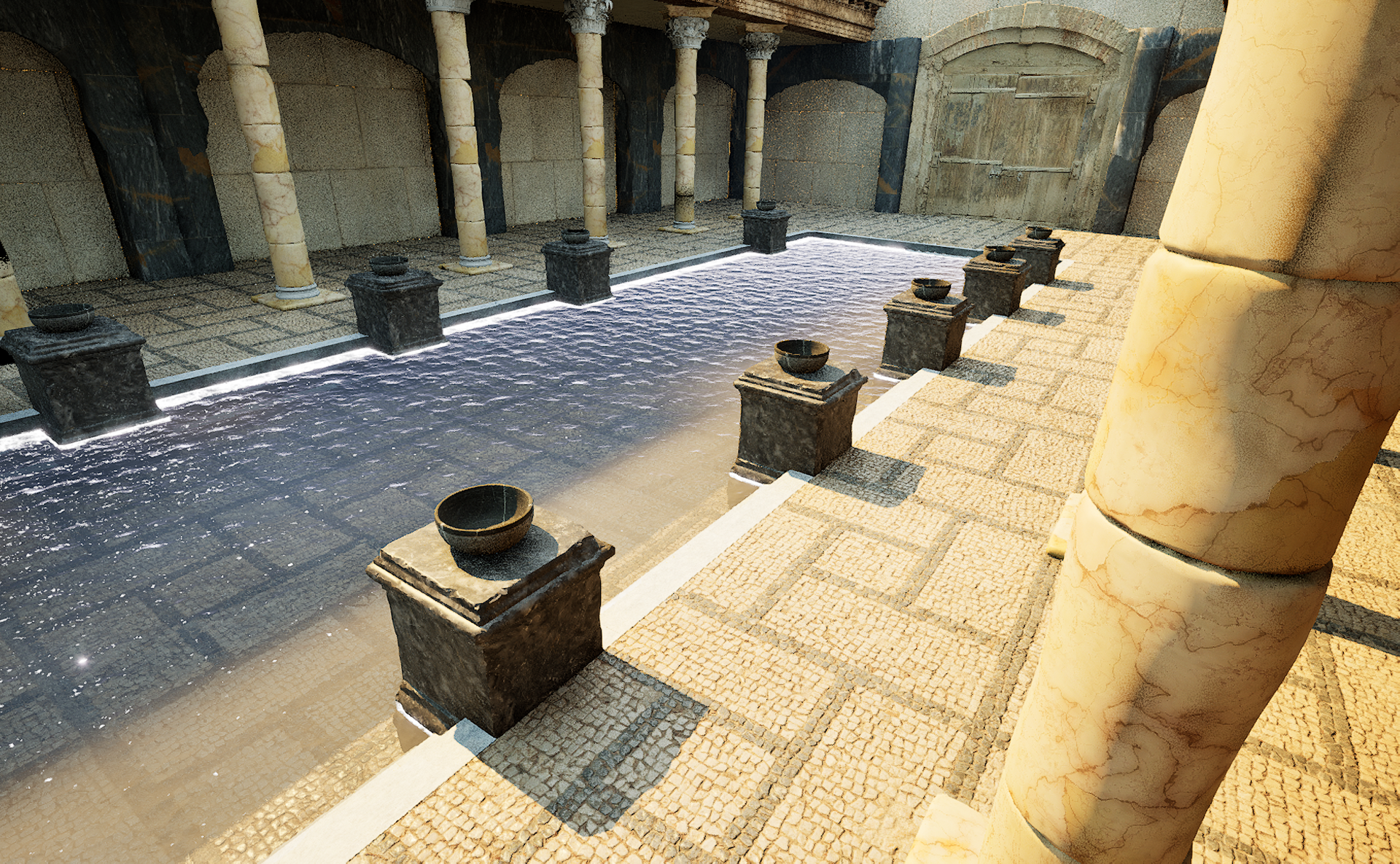 Once the basic layout was done, tweaks were made to the layout to better suit my needs. The second level was entirely abandoned to capitalize on the open-air aesthetics with plans of setting the scene at night. I used Quixel to source a lot of Roman-inspired stone patterns and 3D models for the floors, walls, and environmental clutter for the level.